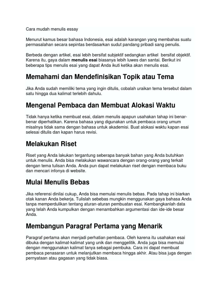 Cara penulisan essay. Nama saya Sari lahir di Bantul 10 Oktober 1998. Kuncinya Anda harus benar-benar memahami dan. Sementara itu Wijayanti dkk menjelaskan bahwa esai adalah karangan atau tulisan yang menyampaikan kejadian yang terjadi di masyarakat atau lingkungan baik berupa fakta atau pengalamanSifat esai adalah argumentatif dan subjektif karena isinya dapat berisi pendapat penulis.