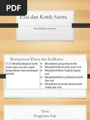 Play this game to review World Languages. Kritik dan esai dibedakan berdasarkan dua hal yaitu berdasarkan pengetahuan yang disajikan dan berdasarkan pandangan penulisnya. Materi Menyusun Kritik dan Esai dengan Memerhatikan Aspek Pengetahuan dan Pandangan penulis Mapel Bahasa Indonesia kelas 12 SMAMA - Halo adik adik yang baik apa kabar.